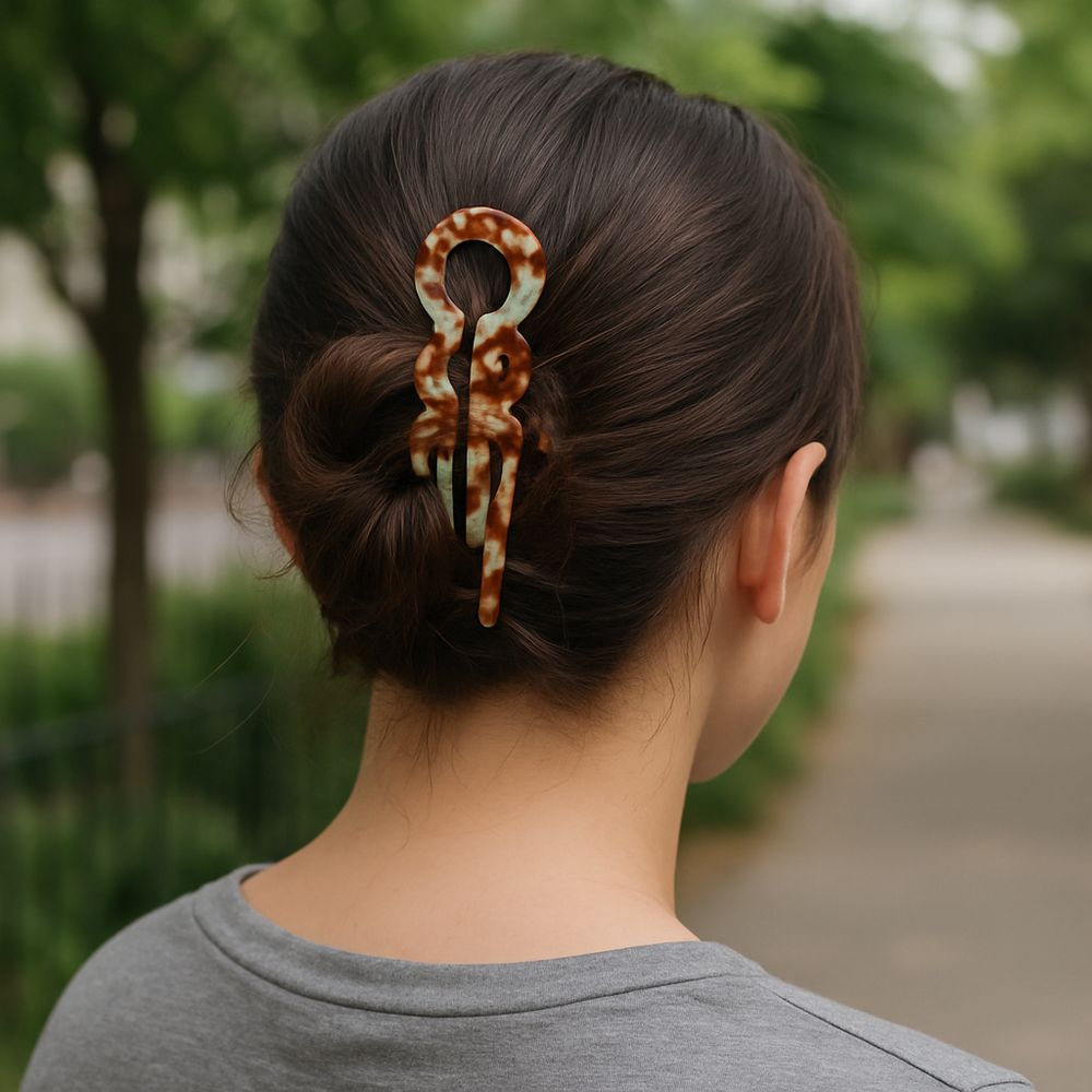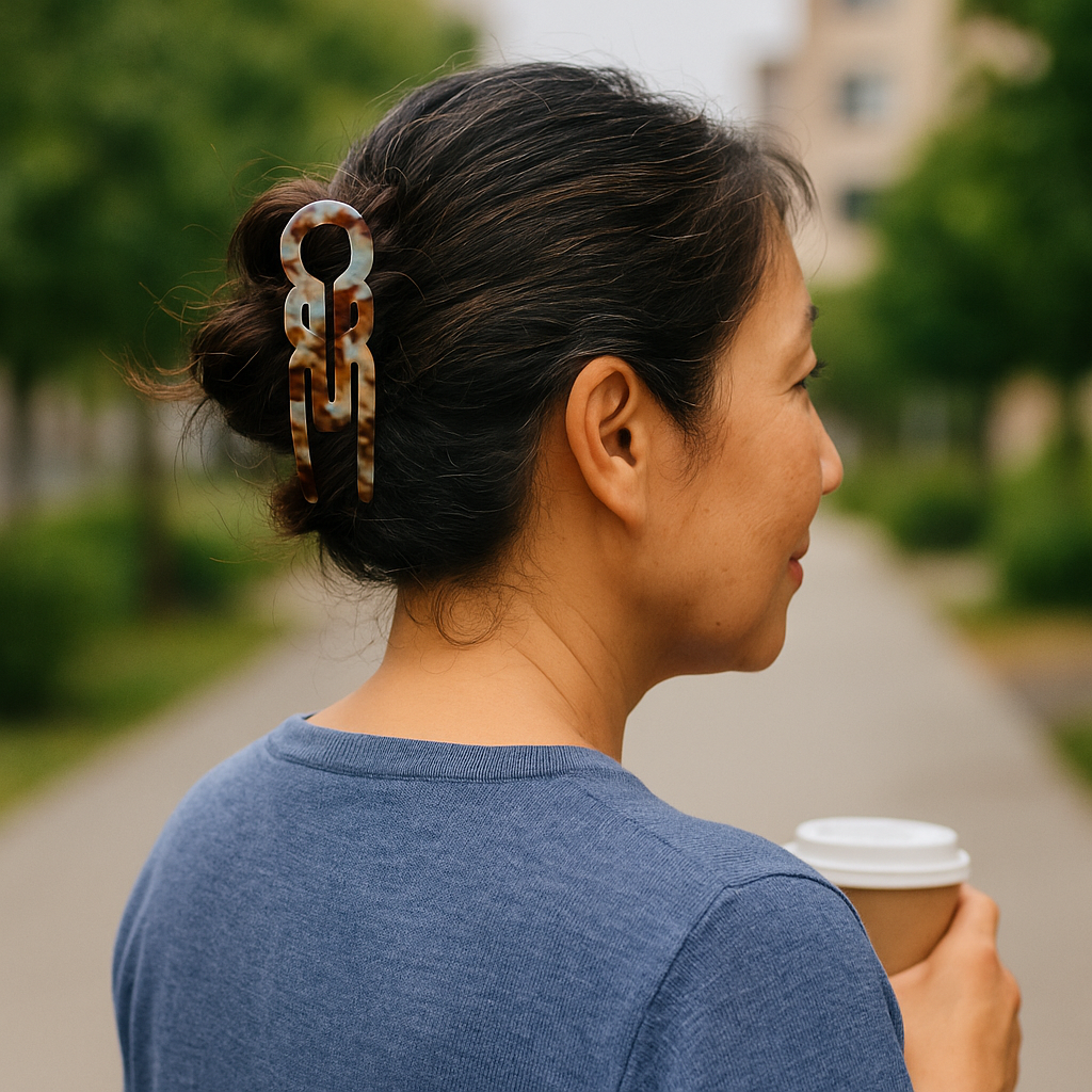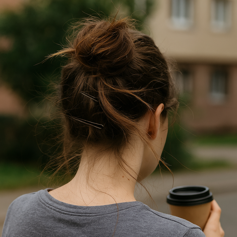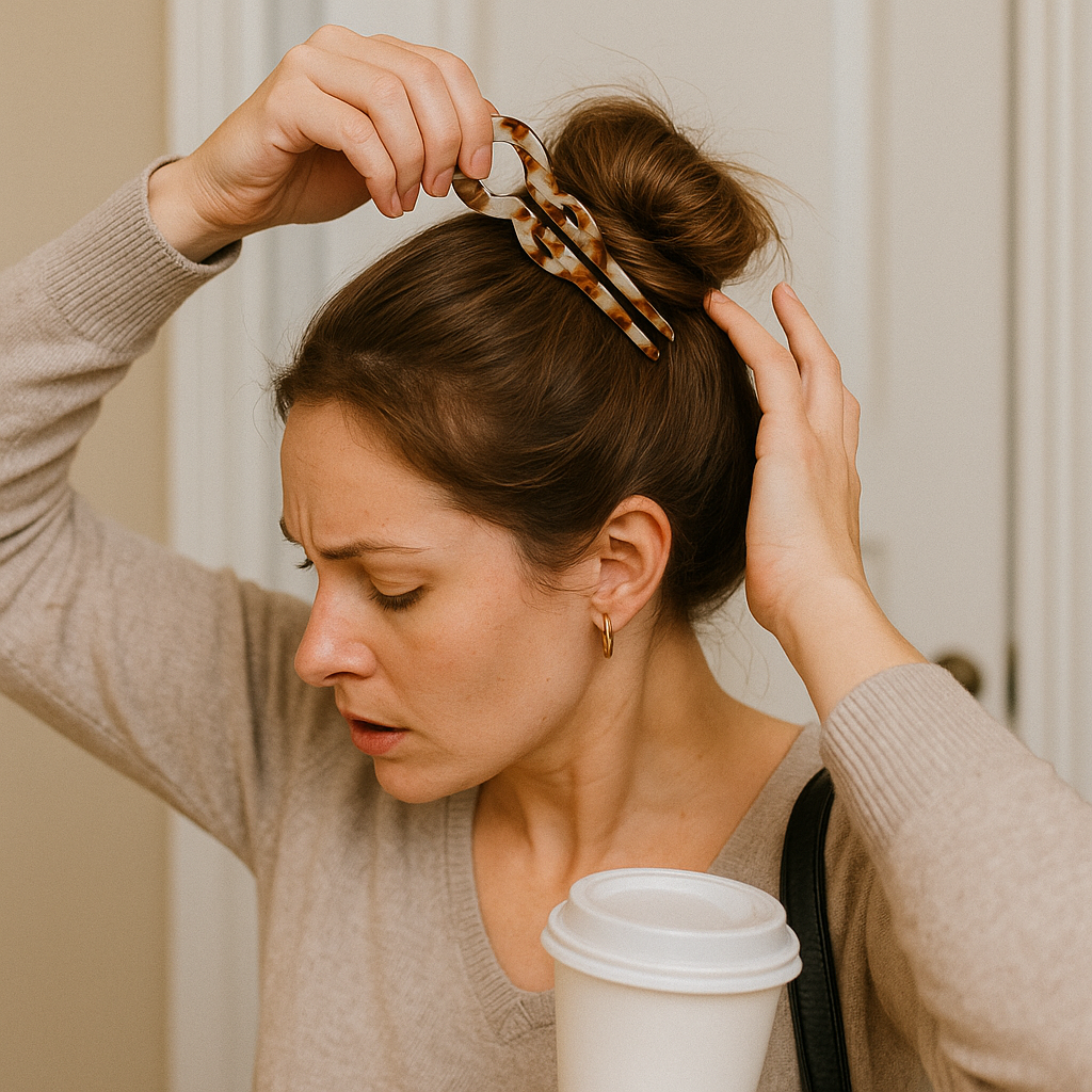Du er sent på den, kaffe i den ene hånd og en computertaske i den anden. Med blot et hurtigt twist og en hårnål er dit hår stylet, sikkert og klar til dagen. Ingen stress, intet rod – bare et poleret look på få sekunder.