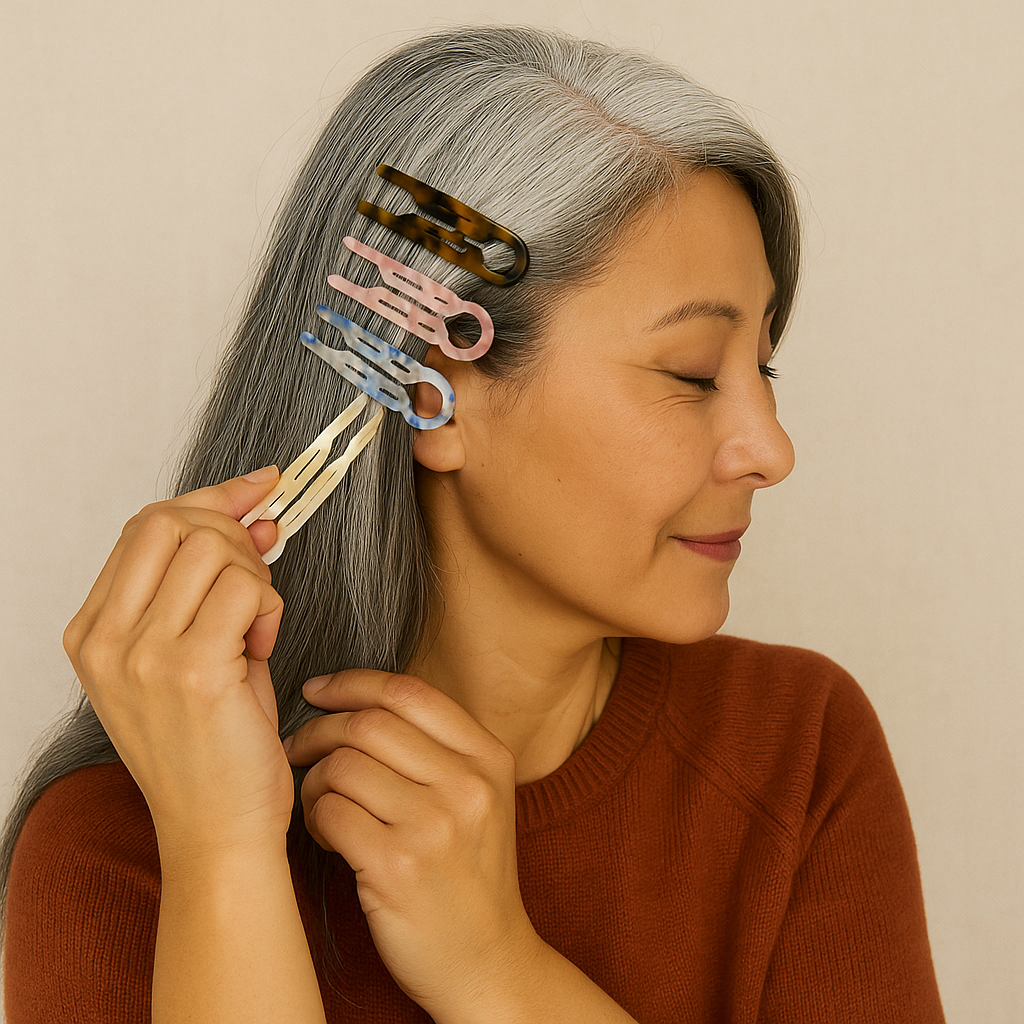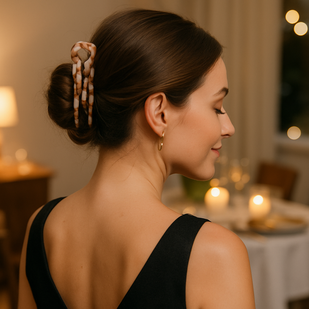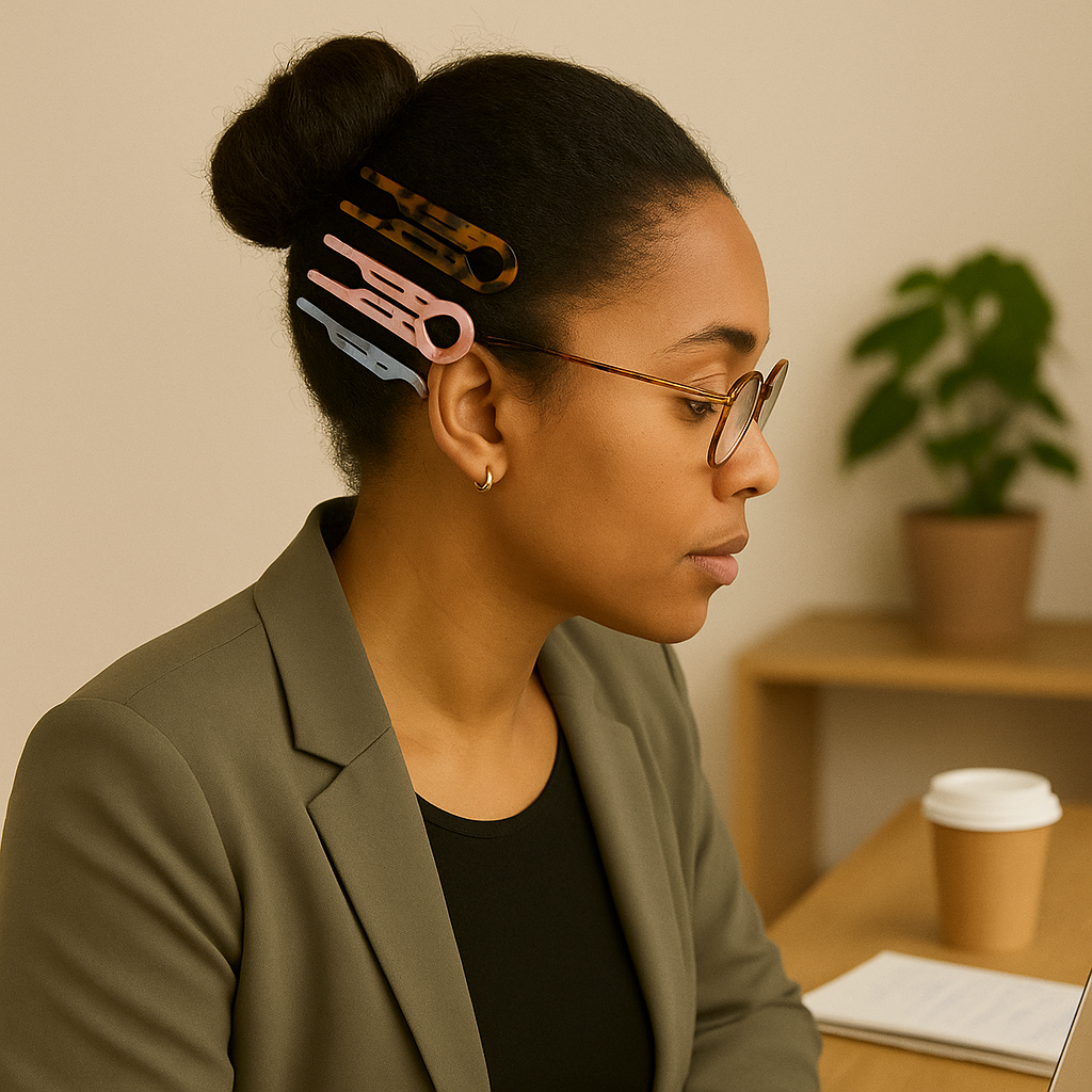 Du er sent på den, kaffe i den ene hånd og en computertaske i den anden. Med blot et hurtigt twist og en hårnål er dit hår stylet, sikkert og klar til dagen. Ingen stress, intet rod – bare et poleret look på få sekunder.