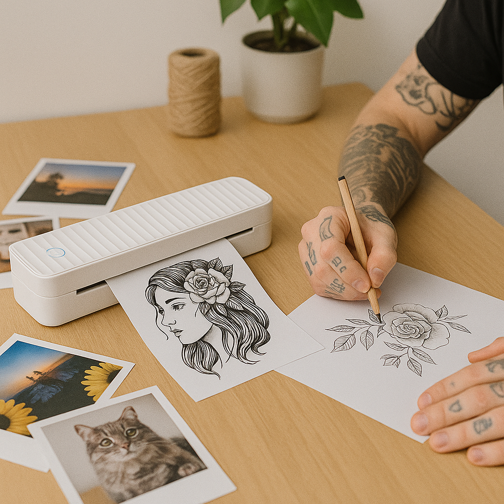 Uanset om det er tatoveringsdesign, fotos eller produktetiketter, understøtter LynPrint flere papirtyper for at bringe dine ideer til live. Skab, print og del dit arbejde på få sekunder – uanset hvor inspirationen rammer.