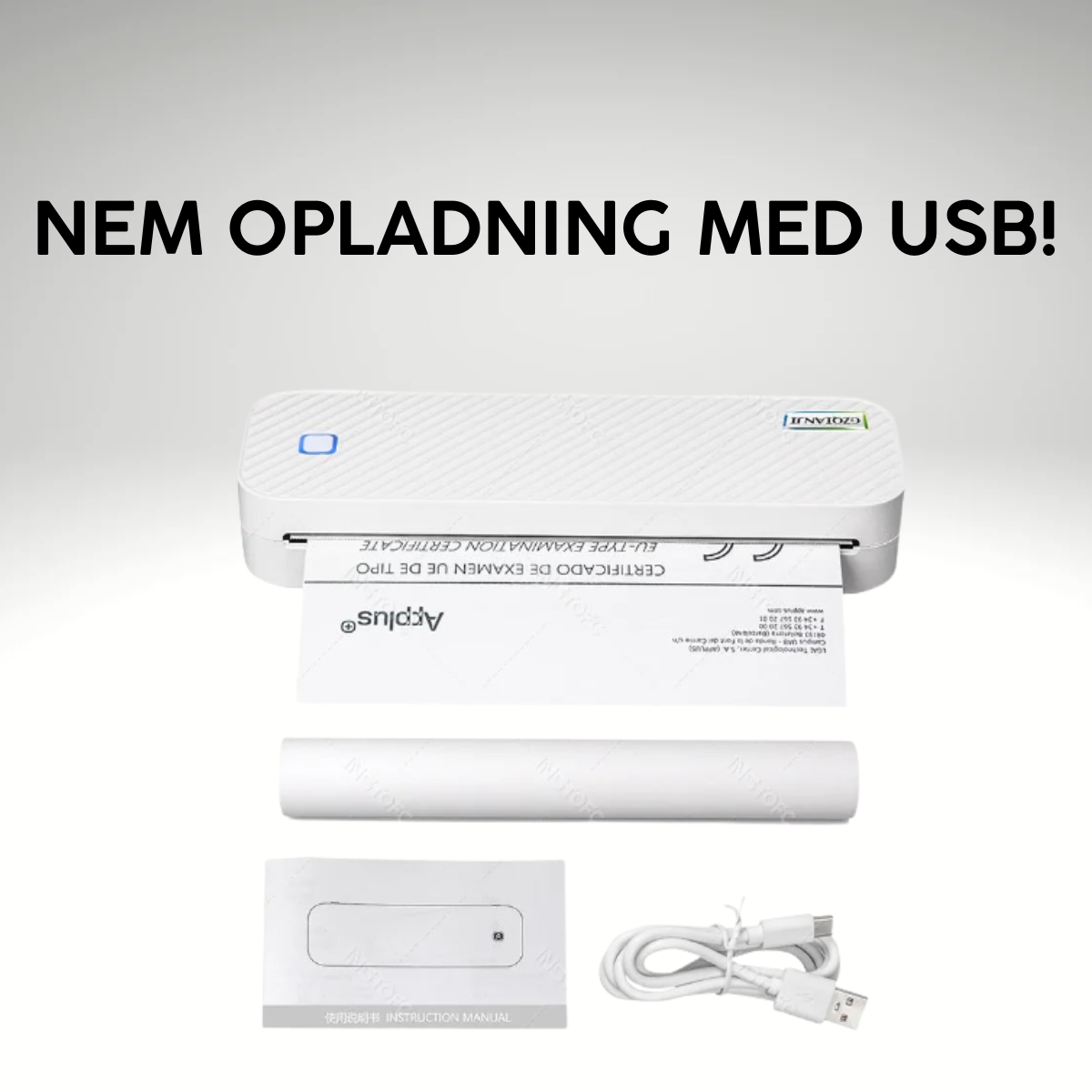 Det indbyggede batteri holder til flere udskrivningssessioner på en enkelt opladning. Du skal blot tilslutte det medfølgende USB-opladerkabel for at oplade det. Du kan endda oplade det, mens du bruger det til kontinuerlig udskrivning.