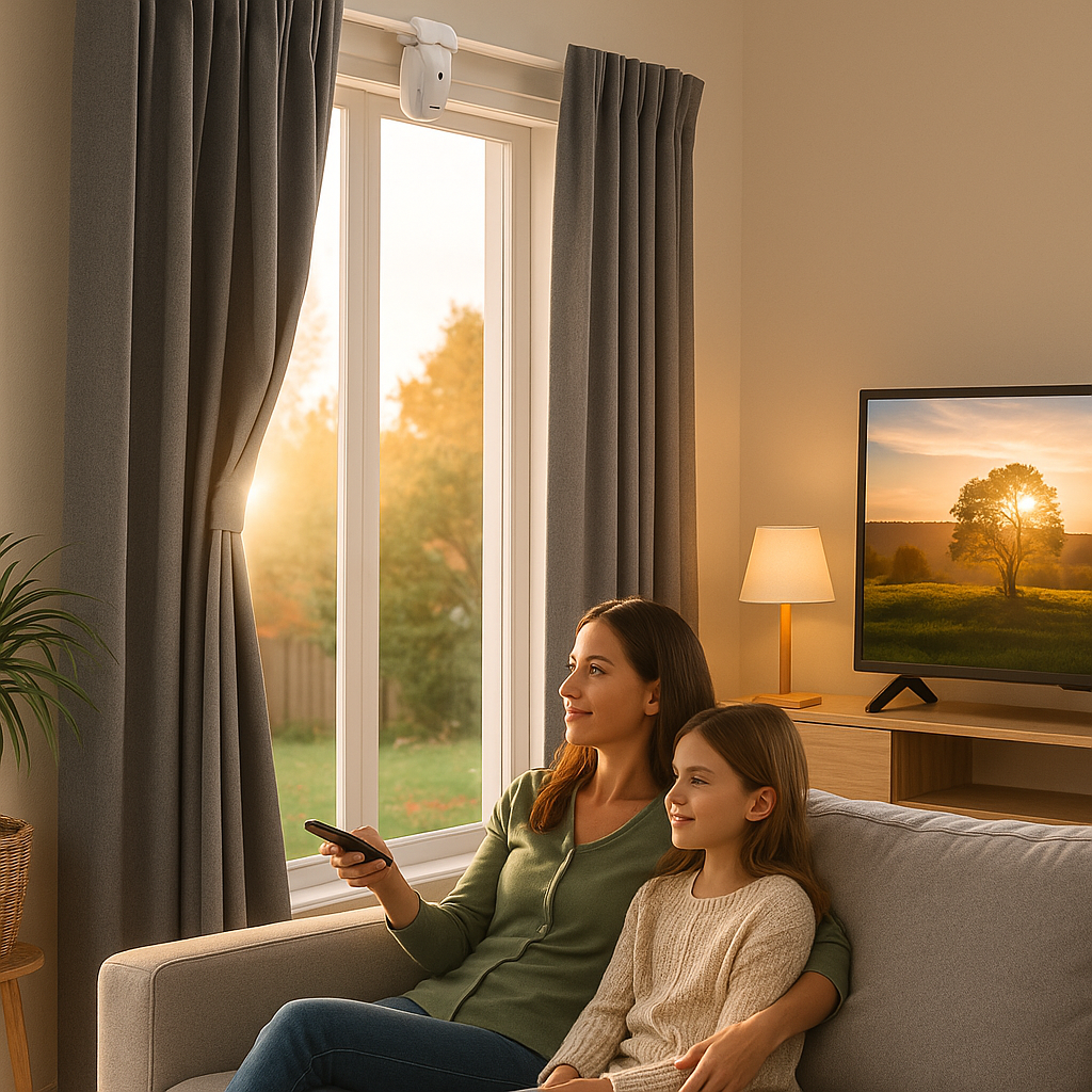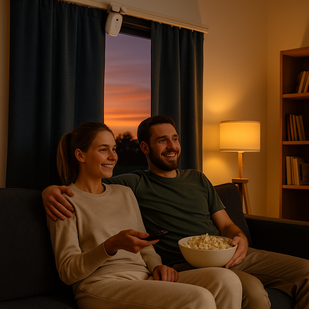 Med et tryk på en knap eller en simpel stemmekommando forvandles din stue – gardinerne trækkes, lyset dæmpes, og stemningen er sat. SmartGardin får hver filmaften til at føles som en hyggelig, filmisk oplevelse – ubesværet, privat og medrivende.